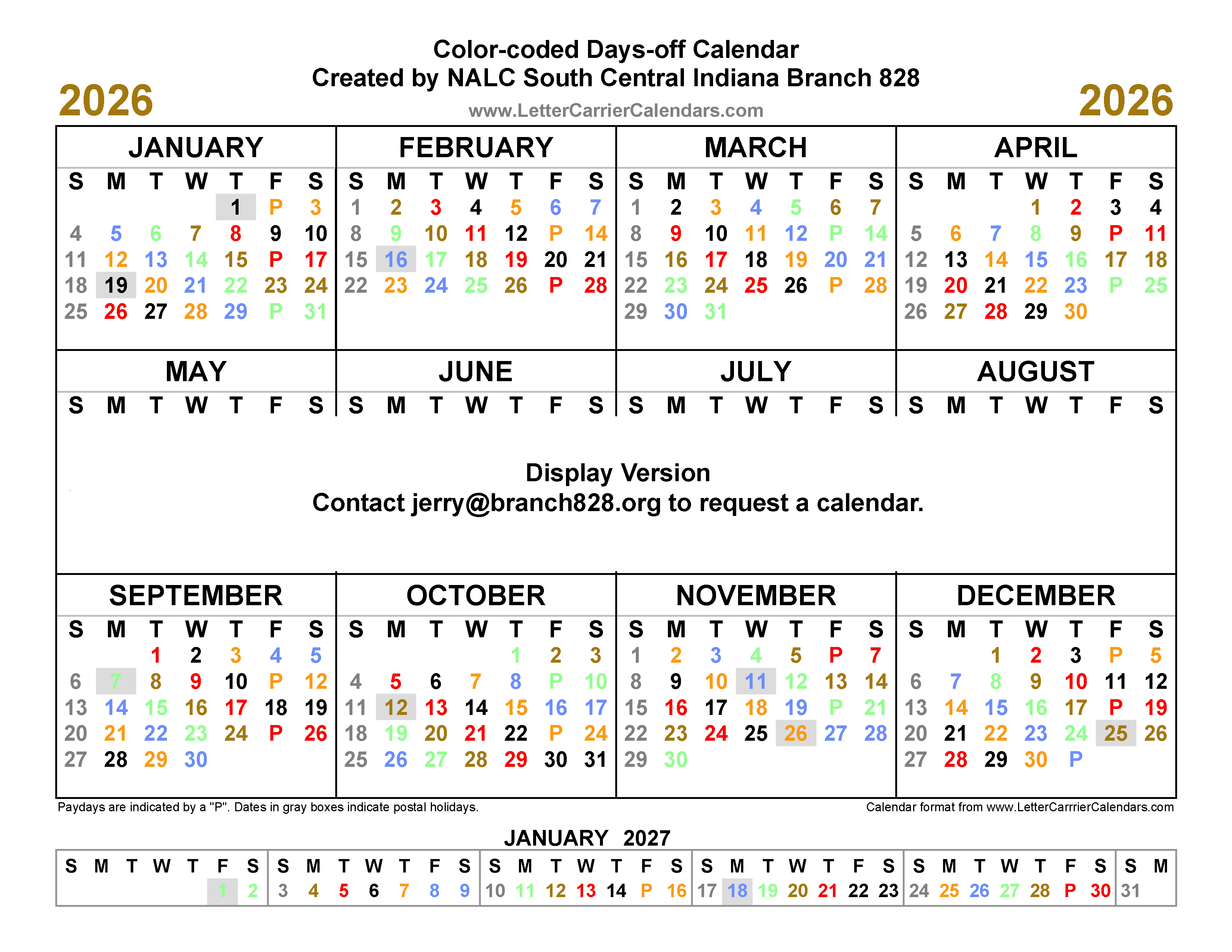 Our calendars are available in two color schemes. Purple version: order of colors is orange (yellow), green, purple, black, red, blue. Brown version: order of colors is red, black, orange (yellow), blue, green, brown. If you are ordering color-coded calendars for the first time, we recommend the purple version. The distribution of colors on the purple version seems to make the colors more distinguishable, and therefore make that calendar easier to read.